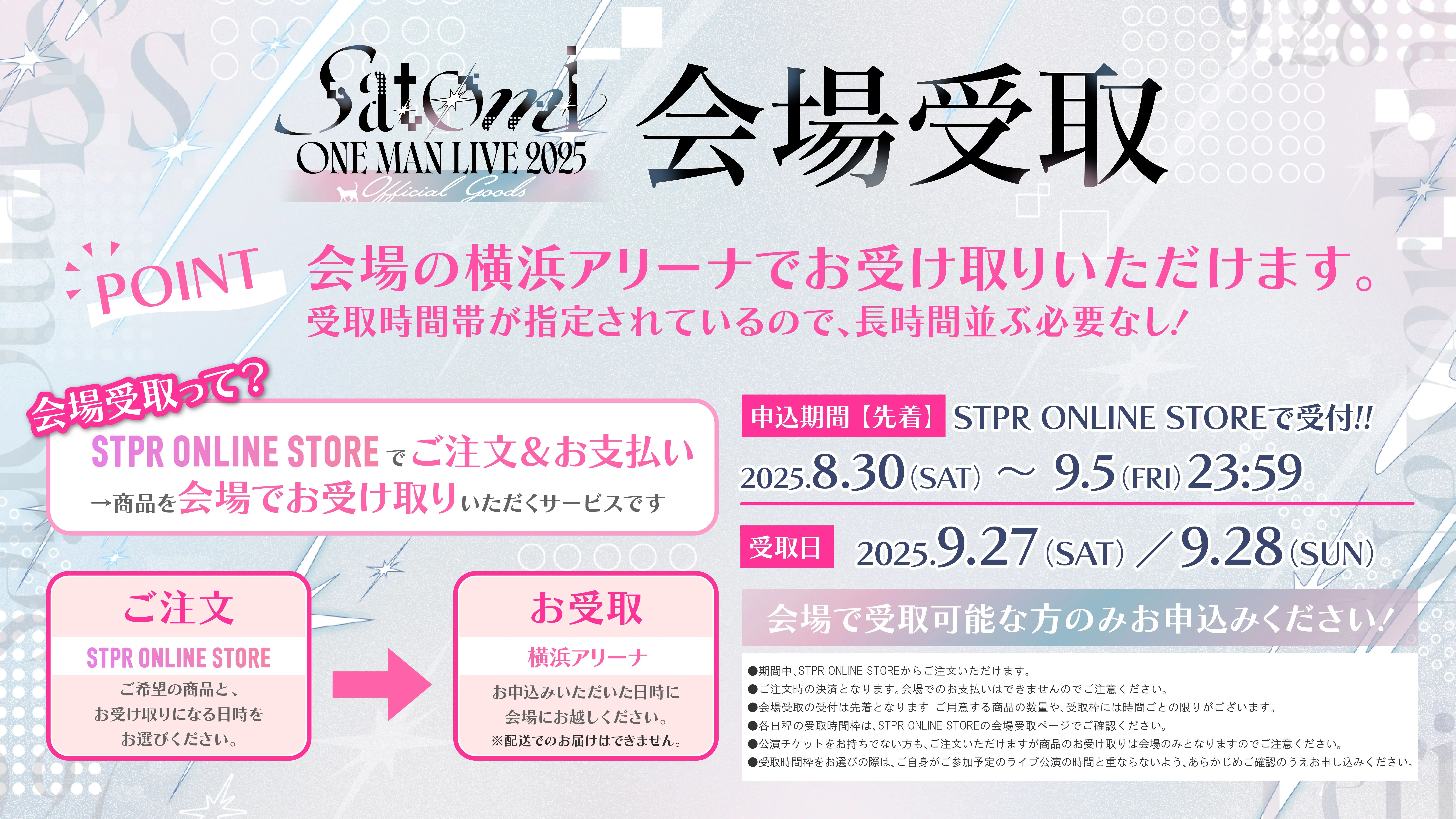 ⇒STPR ONLINE STOREで購入した商品を、横浜アリーナで受け取れるサービスです。