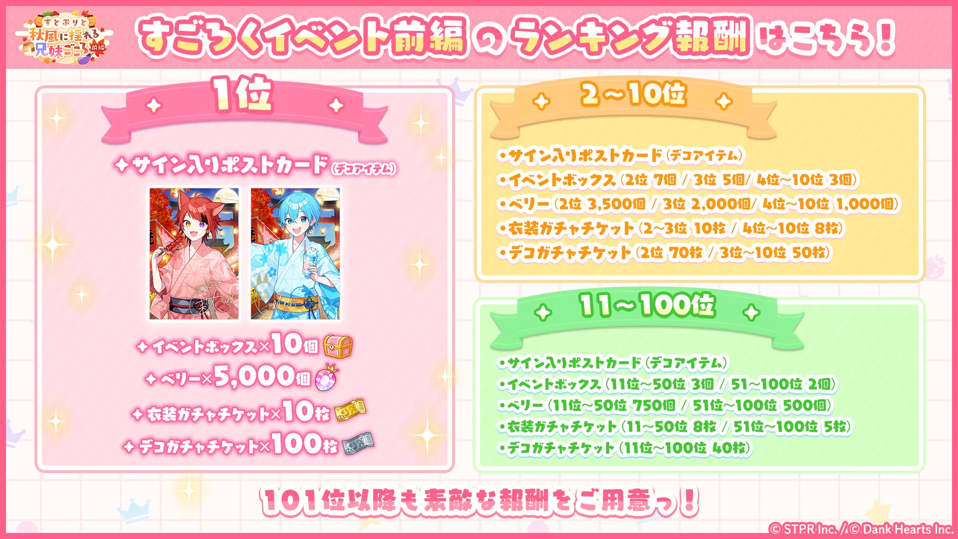 ランキング上位者には特別なデコアイテムやベリーなどの報酬が獲得できるイベントになっています。ランキングに参加した方全員にも報酬を用意しています。イベント開催に合わせて、カード&衣装ガチャやデコガチャ、キャンペーンチャレンジなど様々なコンテンツが追加されておりますので、是非ご参加ください!
