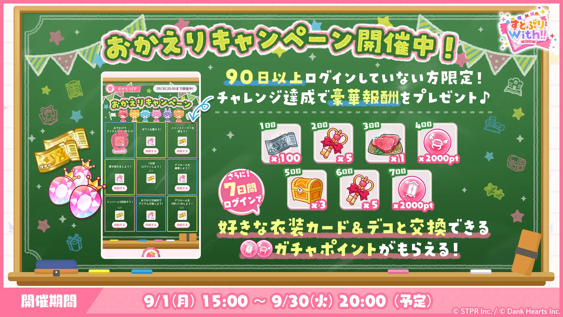 9月1日(月)より、最終ログイン日時から90日間以上ログインをしていない方を対象に「おかえりキャンペーン」を開催します。