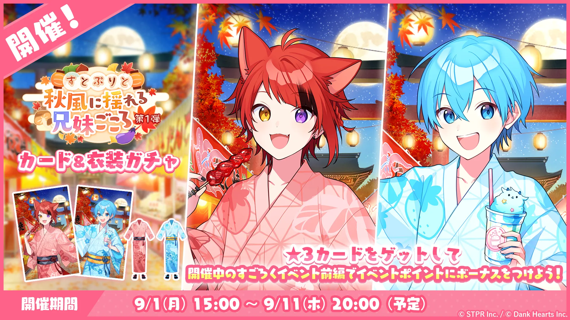 本日9月1日(月)より、新たな★3カードがピックアップ登場する「すとぷりと秋風に揺れる兄弟ごころ 第1弾 カード&衣装ガチャ」 が開催中です!