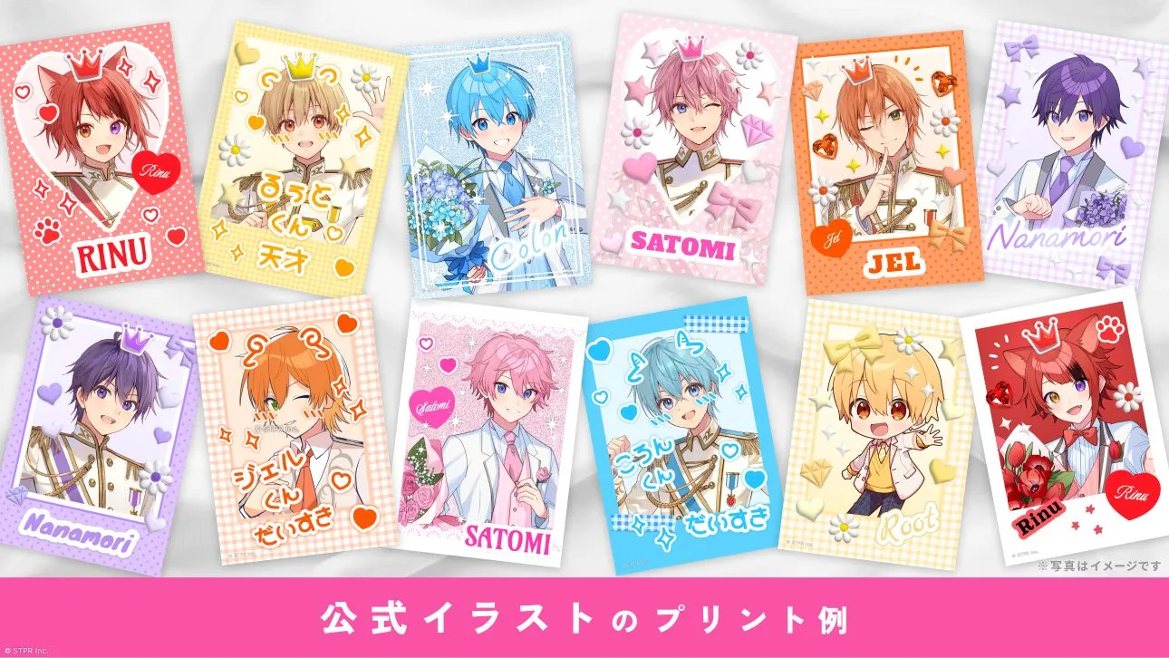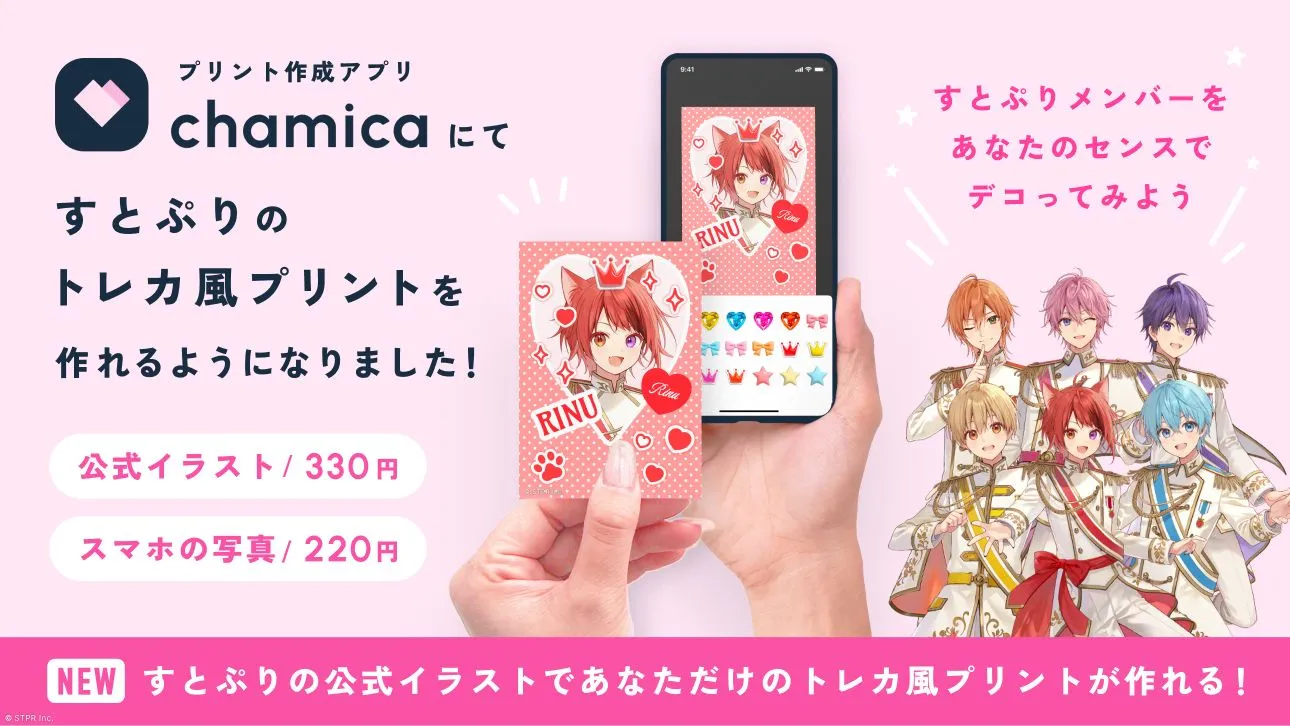 写真プリントアプリ「chamica(チャミカ)」の新機能「chamicaオフィシャル」にて、「すとぷり」のイラストに背景・フレーム・スタンプを自由に組み合わせて、自分だけのトレカ風プリントを簡単に作ることができます。
