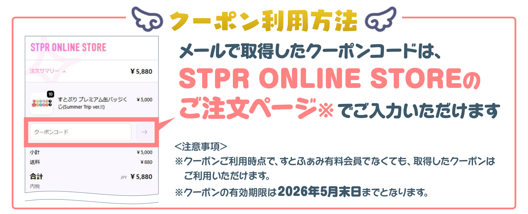 「”新”すとふぁみ」に早期入会いただいた皆様へ、早期入会特典として「STPR ONLINE STORE」の対象商品にご利用いただける【特別クーポン】を発行いたしました。